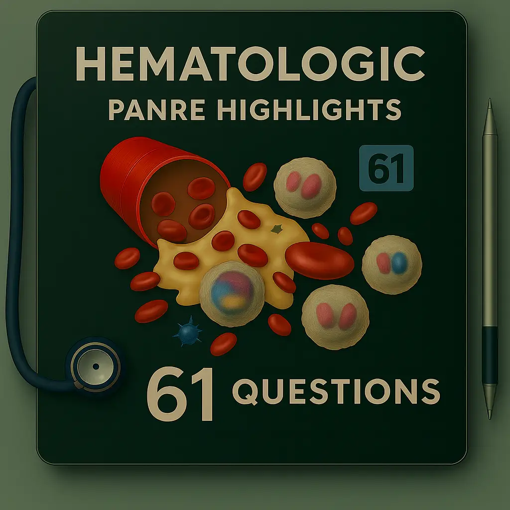 Prepare for PANRE or PANRE-LA recertification with Hematologic PANRE Highlights, featuring 61 high-yield questions spanning anemias, coagulopathies, thrombosis, transfusion reactions, and oncology-adjacent essentials, built for recertification-focused review.